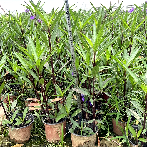 狭叶翠芦莉(学名:Ruellia simplex C.Wright)是爵床科芦莉草属植物。茎直立,高55-110(-150)厘米,与叶柄、花序轴和花梗均无毛,等距地生叶,上部分枝。茎下部叶有稍长柄;叶片五角形,长6.5-10厘米,宽12-20厘米。总状花序数个组成圆锥花序;花梗斜上展,长1.5-3厘米。蓇葖长约1.4厘米;种子倒卵球形,长2.5-3毫米,密生波状横翅。7-8月开花。多年生草本,株高一般不超过30厘米,似从生状,茎节间距较短且致密,老株茎干上有老叶脱落的痕迹。单叶对生,线状披针形,长8-15厘米,叶宽0.5-1厘米,上面浓绿色,全缘或边缘具疏锯齿,有宽叶种和细叶种。原产于墨西哥,中国华南地区有引种栽培。狭叶翠芦莉抗逆性较强,适应性广,对环境条件要求不严,耐干旱能力较强。喜高温,耐酷暑,生长适温22-30℃。不择土壤,耐贫瘠力强,耐轻度盐碱土壤,但较怕积水。对光照要求不严,全日照或半日照均可。喜温暖湿润气候,抗寒力较低,遇5-6℃长期低温或短期霜冻,植株会受到轻微寒害。主要用播种、扦插等方法繁殖,一年四季均可进行,但以春秋为最佳季节。