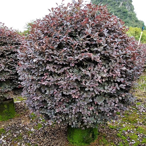 红花继木,又名:红继木、红梽木、红桎木、红檵花、红梽花、红桎花。为金缕梅科、檵木属檵木的变种,常绿灌木或小乔木。树皮暗灰或浅灰褐色,多分枝。嫩枝红褐色,密被星状毛。叶革质互生,卵圆形或椭圆形,长2~5cm,先端短尖,基部圆而偏斜,不对称,两面均有星状毛,全缘,暗红色。花瓣4枚,紫红色线形长1~2cm,花3~8朵簇生于小枝端。蒴果褐色,近卵形。花期4~5月,花期长,约30~40天,国庆节能再次开花。花3~8朵簇生在总梗上呈顶生头状花序,紫红色。果期8月。红花继木,多为自然式形态,球形形态,造型桩景形态。自然形态及球形形态测量自然高度,自然冠幅、造型桩景形态则需满足造型托叶丰满有层次感、质朴古拙,多杆测量则依次相加各主杆之和。